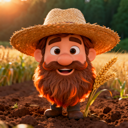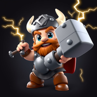 Flux Schnell$3D animated character game icon, a cute but fierce cartoon Viking character gripping a massive oversized thunder hammer, big expressive eyes under a horned helmet, the hammer sparking with bouncy cartoon lightning bolts, chunky stylized armor with rounded edges, standing heroically with a big grin, 4000x4000