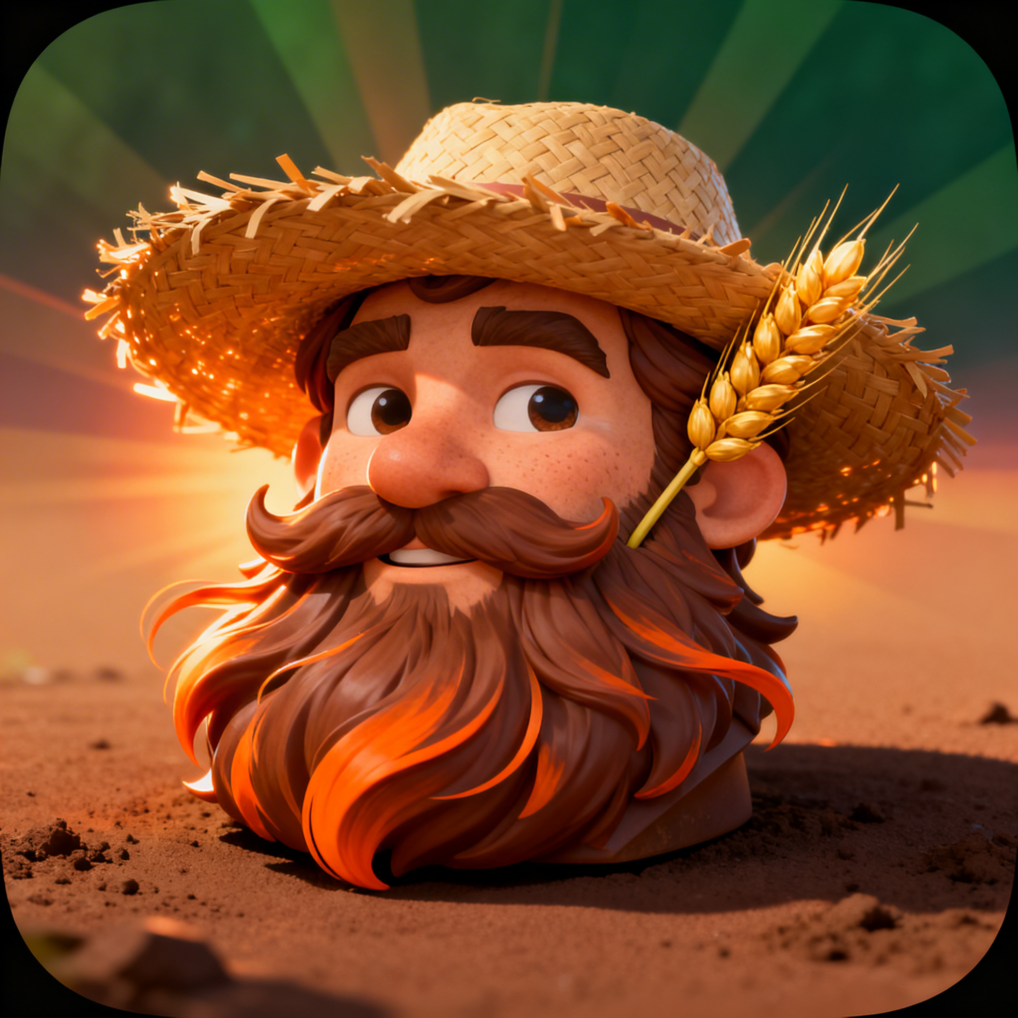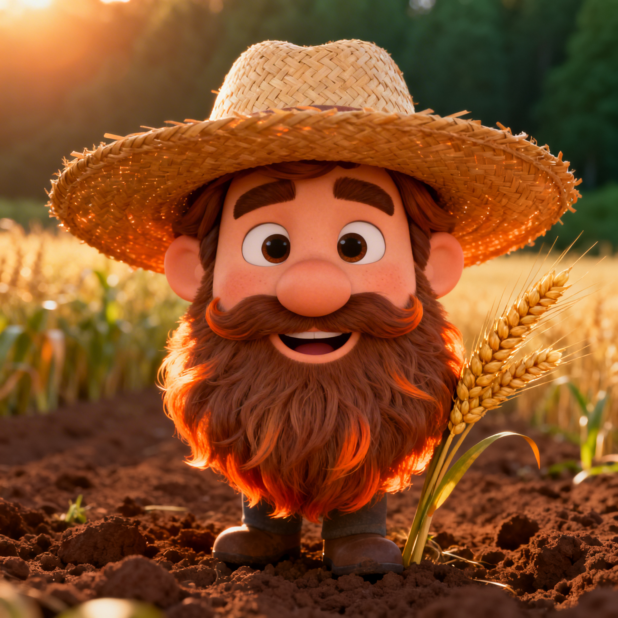 "scene": "a friendly farmer character portrait from chest up, wearing a wide straw hat and a thick beard, a wheat stalk behind his ear, standing in a sunlit farm field with blurred crops behind him",
