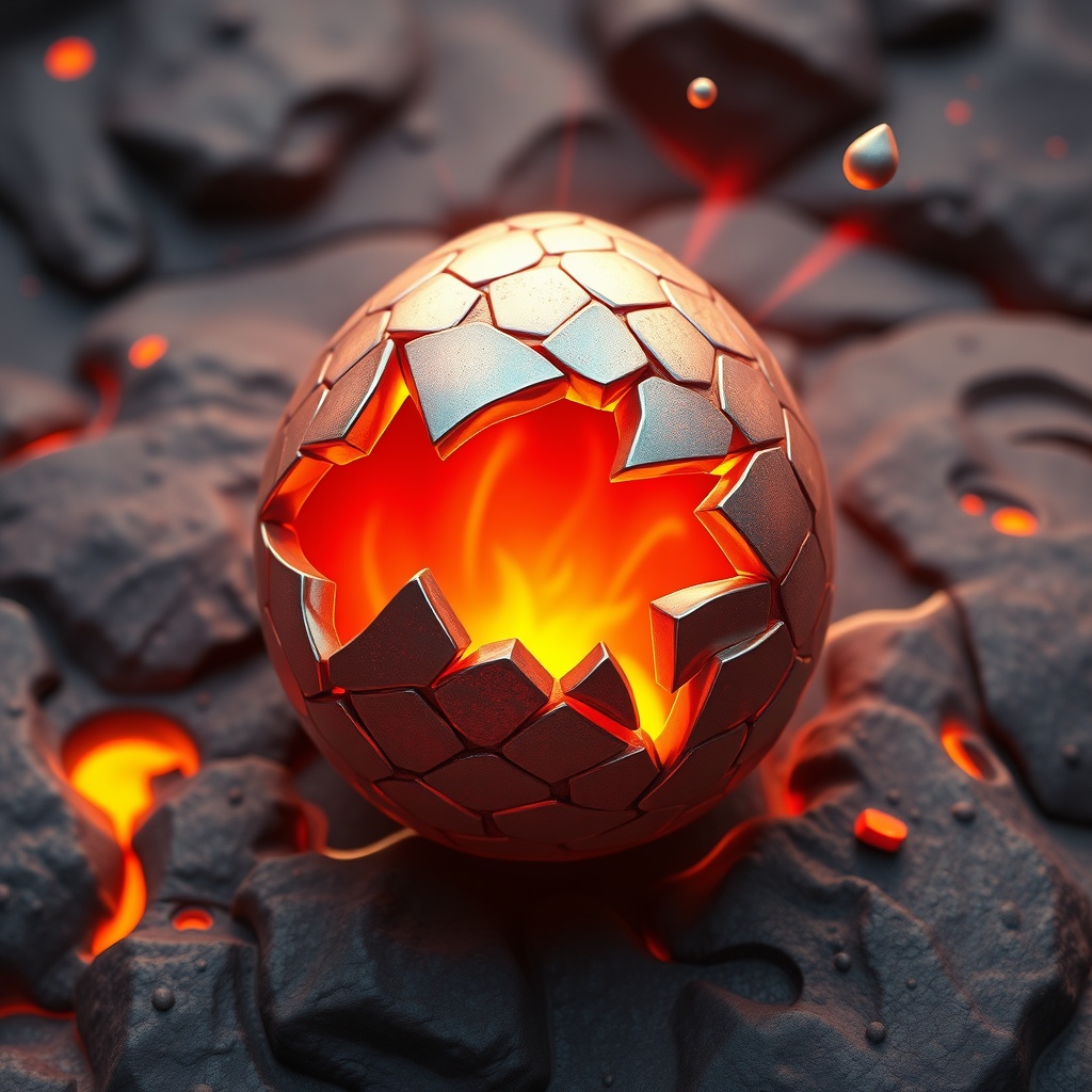 "lighting": "dramatic inner glow from cracks with warm volcanic ambient light"