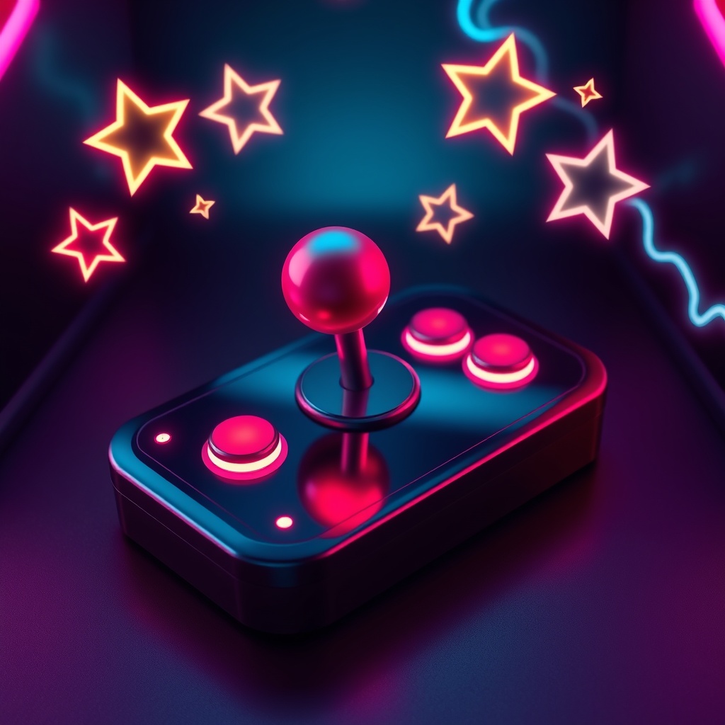 "main_object": "classic arcade joystick with glowing neon buttons",