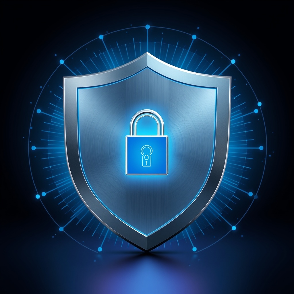 "main_object": "sleek metallic shield with a glowing digital lock at center",