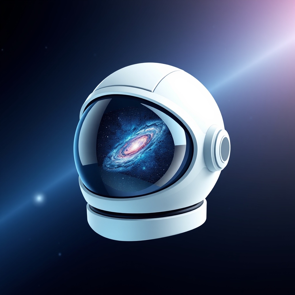 "scene": "a futuristic astronaut helmet with a reflective visor showing a galaxy, placed dramatically on a smooth deep space background with subtle depth and shadows",