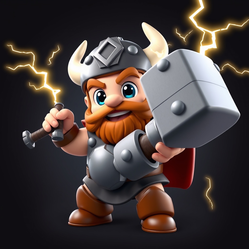 "main_object": "cute cartoon Viking character with oversized thunder hammer",